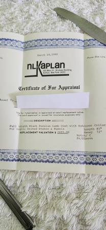 Reasonable offer will be considered. Full Length Black Persian Lamb Coat with Kohinoor Collar. Fur origin is USA and Russia. Length is 45". and Sweep is 72" (that is across front from under arm to under arm). I would consider this an XL size as it was bought for me when I was heavier. The Sleeve is a straight sleeve. The collar is notched. 2 Pockets located on each side in front. Beautiful embroidery on the lower inside of coat lining. The upper inside has my name embroidered inside so you can use that as an identifier or rip it out (I did not photo that part). But if I was purchasing, I would leave it in as nobody would guess the name inside. Also included is the Certificate of Fur Appraisal with the replacement valuation of $2495. I have to be honest, I only wore this once so that is why it is labeled new.