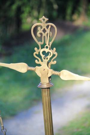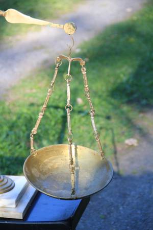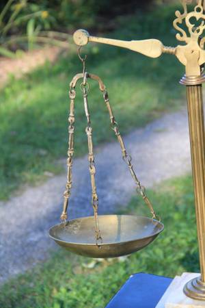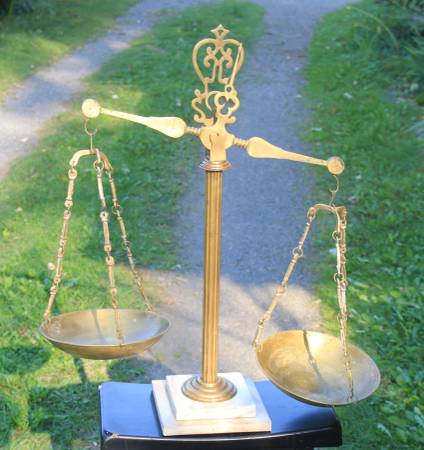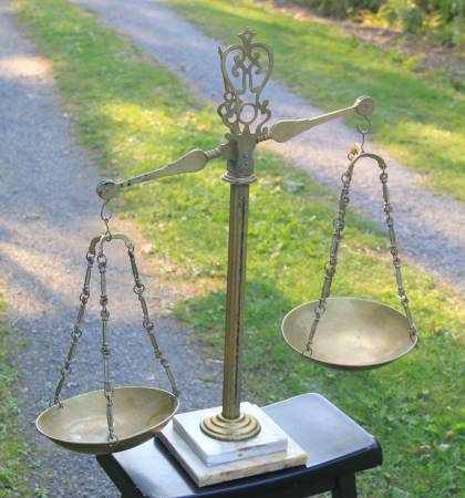 Vintage brass balance scale! Rare! Double marble pedestal base. Charm! But stately character piece for any decore! Works! SUCH a great piece! Head turner! Polished up it'll be a beauty!