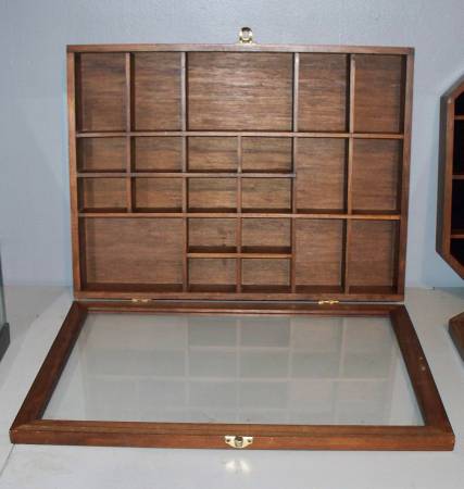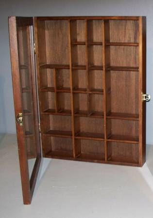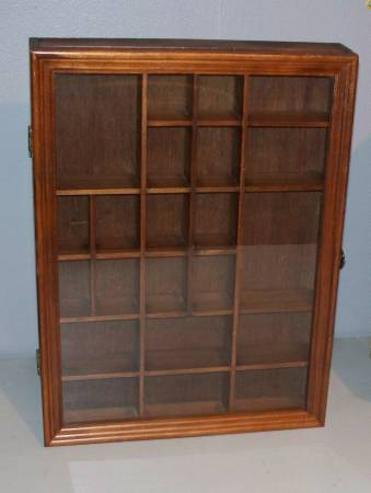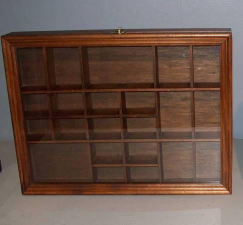 Glass Door Walnut Wood Display Cabinet. Measures 16" x 12" x 2". In excellent smoke free home condition see pictures. Can be hung vertically or horizontally. Asking $25.00. Great for small item collectibles such as Lego Minifigures, Zippo Lighters etc. If interested please call only no texts to show contact info