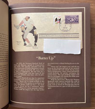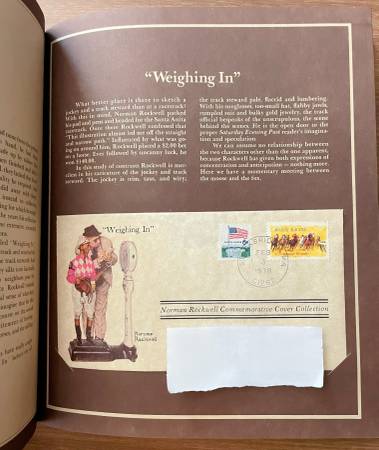 9 1/2” x 11” leather bound Collector Edition album. A limited edition collection of eight philatelic covers bearing eight classic Rockwell paintings and historic US stamps in harmony with each painting postmarked on the 84th anniversary of Rockwell's birth. Each of the cachets in this collection faithfully captures a famous Saturday Evening Post cover done by Norman Rockwell. Several short stories are included about Rockwell. They have the former owners name and address beautifully typed on the envelope. Excellent like new condition.