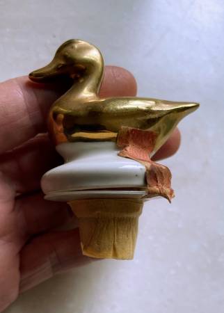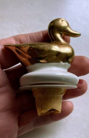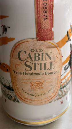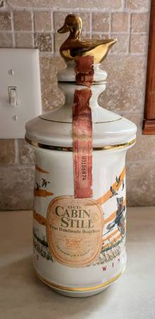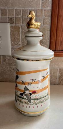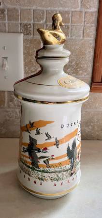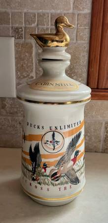 Vintage 1972 Cabin Still Bourbon (empty) Decanter, Ducks Unlimited, “Wings Across the Continent”. Larry Toshik painting of flying ducks. Made of genuine Talisman Porcelain with gold trim. Empty. Limited edition. 10 1/4” high, 4” diameter at base.
