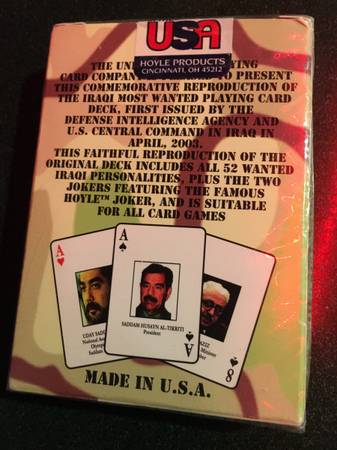 Saddam’s favorite deck of cards to play Solitaire with. New, still sealed in plastic. Contact if interested and check out my other ads too, thanks.