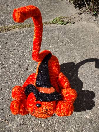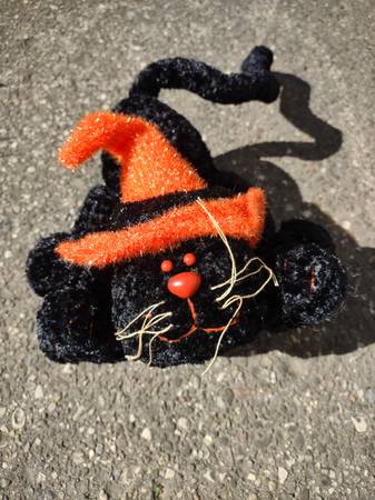 Purrfectly adorable brother and sister cats clad in witch hats for a spooky effect. One is orange with black hat and the other is black with orange hat. They have weighted bottoms and wired tails to pose in many positions. Approximately 10" with another 12" of tail. Too darn cute.