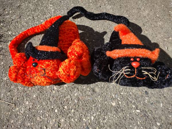 Purrfectly adorable brother and sister cats clad in witch hats for a spooky effect. One is orange with black hat and the other is black with orange hat. They have weighted bottoms and wired tails to pose in many positions. Approximately 10" with another 12" of tail. Too darn cute.