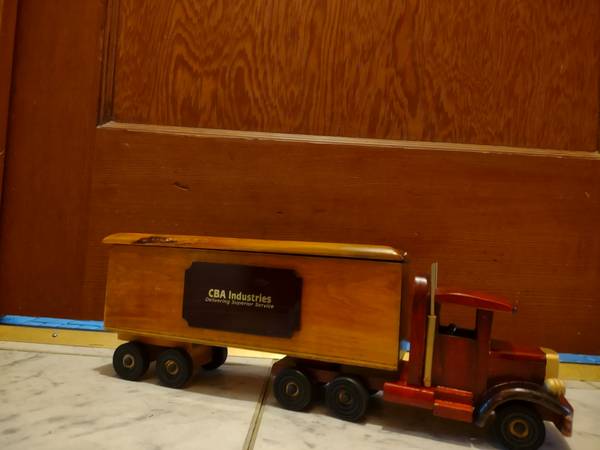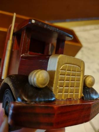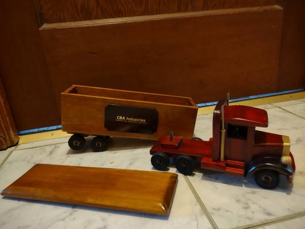 Gorgeous hand made wooden tractor trailer. Made with multiple woods. Trailer is 9 1/2" and detachable from cab. The top also is removable from the trailer to store any secret stash. Have original...
