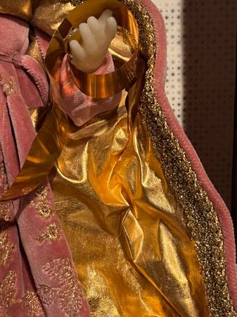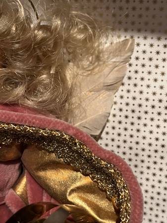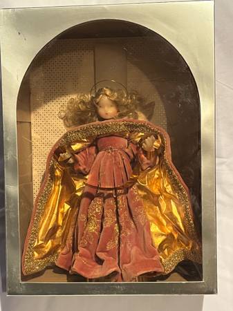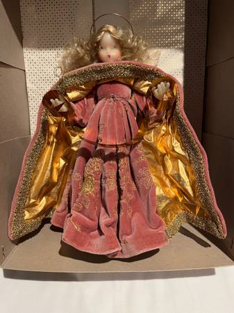 Vintage Wax Angel Christmas Tree Topper made by Pauline Leidel-Spreen NEW in original box - never taken out or used Handmade dusty rose velvet embroidered with sparkling gold thread Gold lined cape...