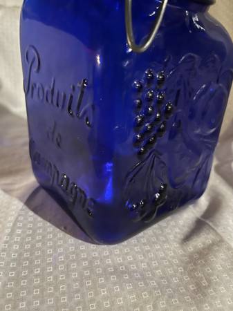 Vintage "Casadis Milano" Cobalt Blue Glass Farm Product Canister / Storage Jar Made in 1960s Embossed on one side is "Produits de Campagne", "Farm Products", a fruit design and on the bottom "Made...