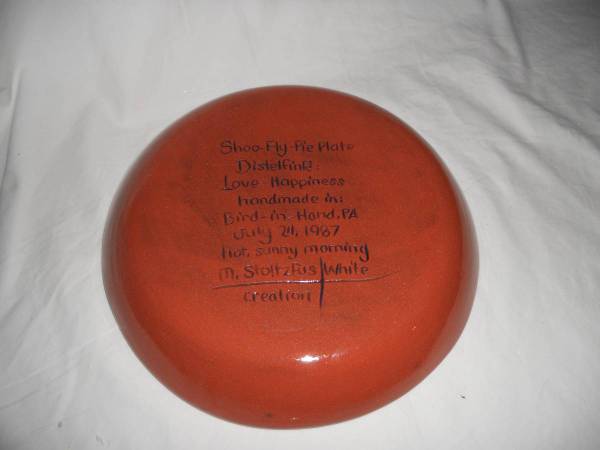 Vintage Ceramic Shoo-Fly Pie Plate Plate is handmade, dated July 24, 1987, and signed Bottom is rust colored and interior is stone speckled Plate was made in Bird-in-Hand, PA and has a bird on the...