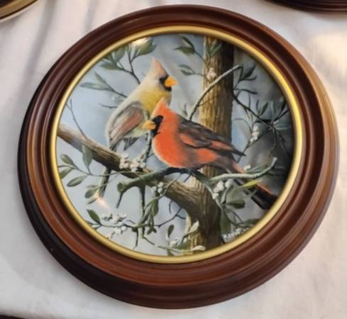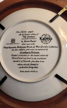 This is a pre-owned wooden framed 1985 limited edition collector's plate entitled "The Cardinal" by Kevin Daniel, a first issue in the Encyclopedia Britannica Birds of Your Garden Collection, and the first collector's plate series ever sponsored by Encyclopedia Britannica. The plate measures 8.5" diameter, 11" with frame.