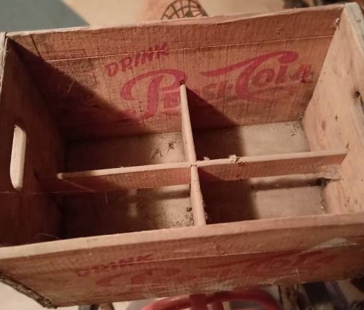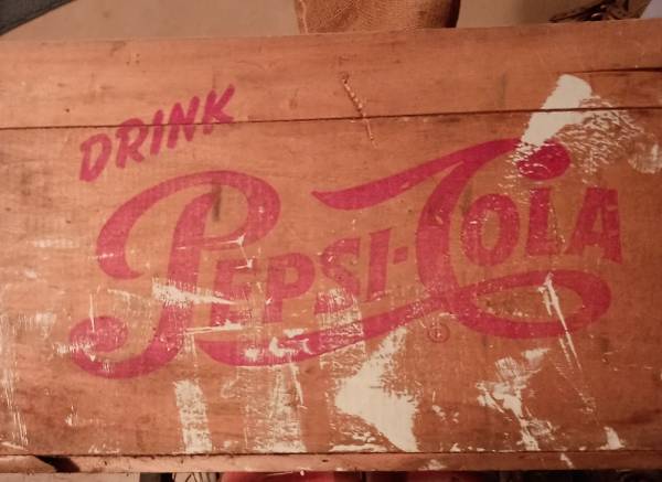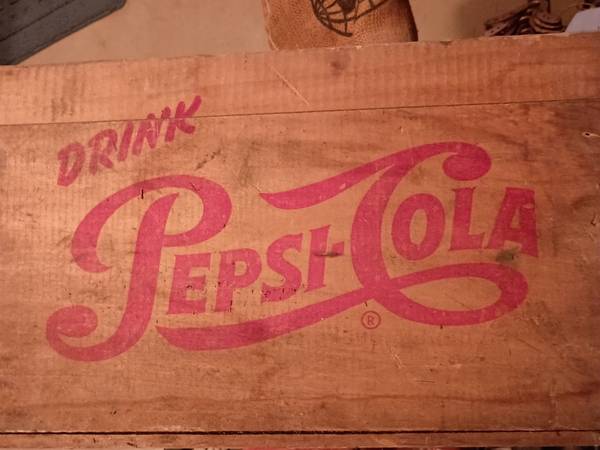 This authentic vintage Pepsi cola wooden crate, features bold red " drink Pepsi cola"local on both long sides and short side also label Buffalo New York. Was originally used to transport glass soda bottles. Made from sturdy wood and metal corner reinforcement. It has a rich patina from age and use giving it a rustic collectible charm perfect for vintage decor. Condition - show some scuff and wear with minor paint splatters on backside only. $35.