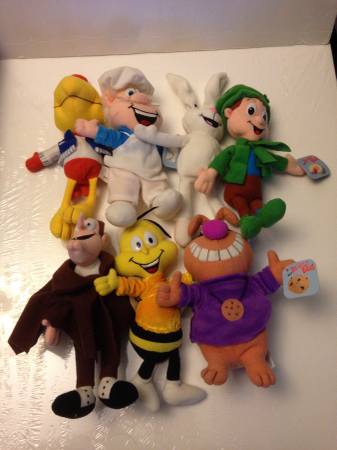 General Mills cereal Breakfast Babies character plush toys set of 7 from 1997. All toys are in mint condition with original tags. no packaging. all between 8-11 inches in length. - $100