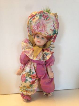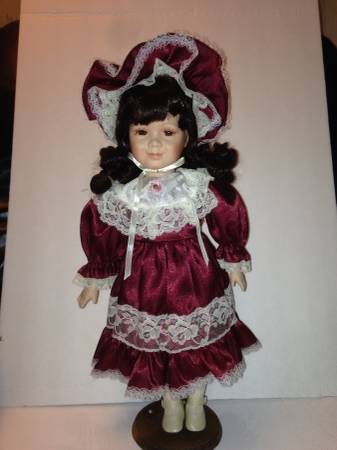 maroon dress porcelain doll with wooden stand. new. no tags or packaging. 18.5 inches. - $20