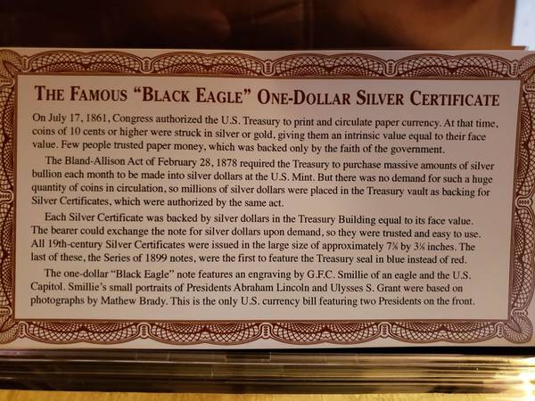 The Series of 1899 $1 Silver Certificate occupies a unique place in numismatic lore. It is the only currency ever printed to feature two U.S. Presidents — Abraham Lincoln and Ulysses S. Grant — on the front. Known as the “Black Eagle,” this note was part of the last series of Silver Certificates issued in the 1800’s. These “horse blankets,” or large-size notes, date back 150 years and are more than half an inch taller and an inch longer than today’s bills.
