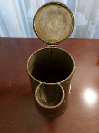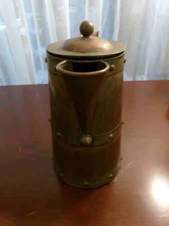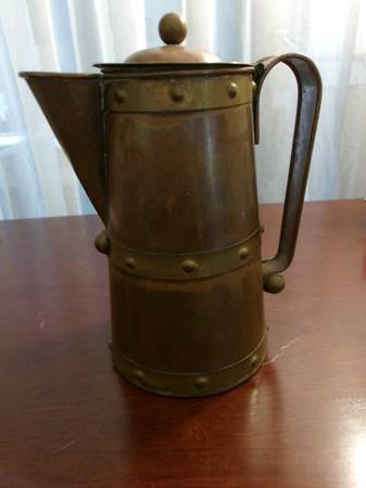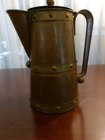 * COPPER & BRASS PITCHER w/ lid by JUAN QUINTO, Taxco Mexico. vintage. 10" high with base of 5 1/4" base. handle is 7" long. Excellent condition ~ no dents.