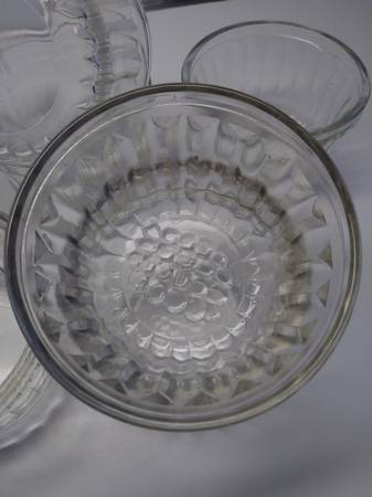 9 ribbed clear glass jelly jars. Five of the jars have Hazel-Atlas markings on the bottom. All are in useable condition, one has a tiny nick on its rim.