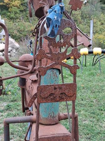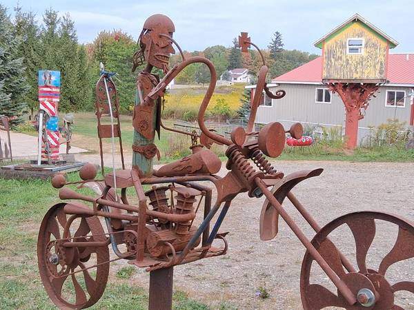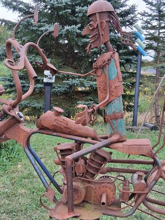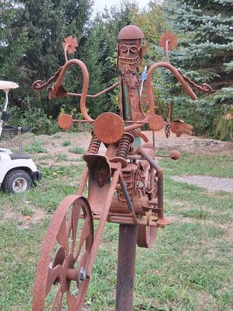 This biker sculpture is a one of a kind creation entirely hand made. It measures approx. 6' tall and 8' long. It is entirely made of metal and has a spot to put a flag.seven16seven96seven913. Thank...