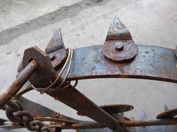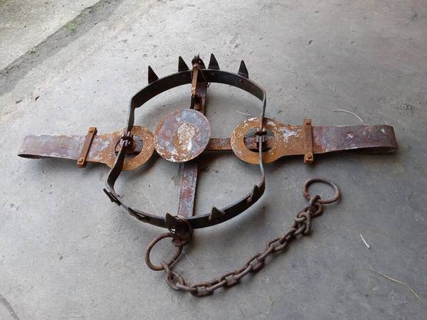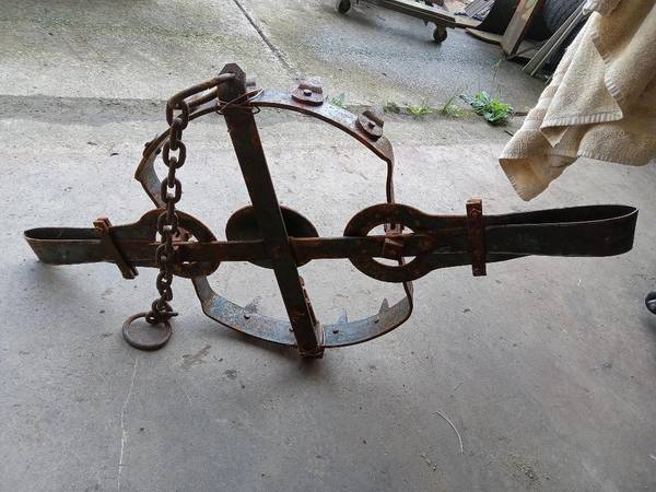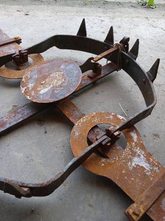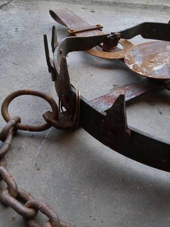 This trap was hand forged by a Blacksmith. It . Measures 40" long . Jaws are 15" from pin (hinge) to pin and 22" wide. There are 2 brackets holding it open to prevent any injury. It's a one of a kind. It's made out of steel like they always have been. ...What you got to trade??? seven16seven96seven913