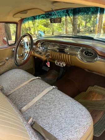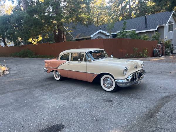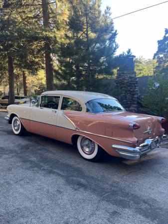 1956 OLDSMOBILE ROCKET 88 RESTORED. 324 V-8 MOTOR - 4- SPEED AUTOMATIC TRANSMISSION. LASER STRAIGHT BODY, BEAUTIFUL 2 TONE PAINT, SHOW QUALITY CHROME , NICE STAINLESS, GORGEOUS FACTORY INTERIOR, ALL NEW GLASS, SIRIUS RADIO , COKER WHITE WALL TIRES , POWER STEERING, FRONT DISC BRAKES, DETAILED MOTOR COMPARTMENT AND TRUNK. VERY CLEAN CALIF CAR. CLEAN TITLE IN MY NAME, CURRENT REGISTRATION, INSURED, RUNS AND DRIVES LIKE A CADILLAC! $32,500