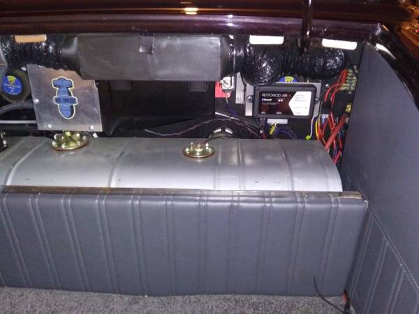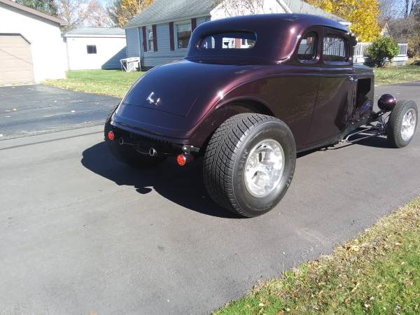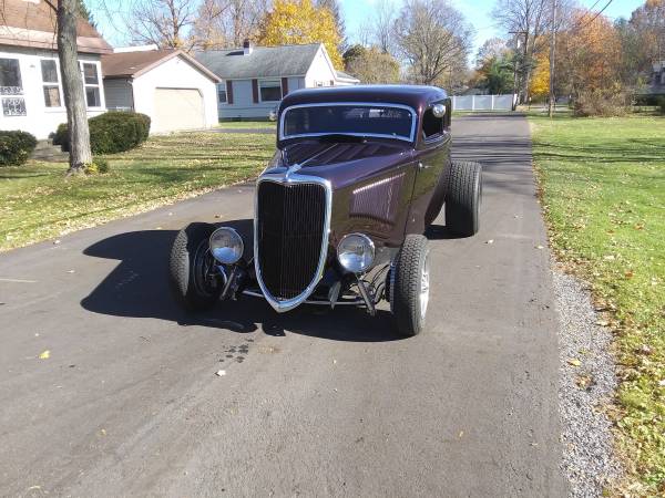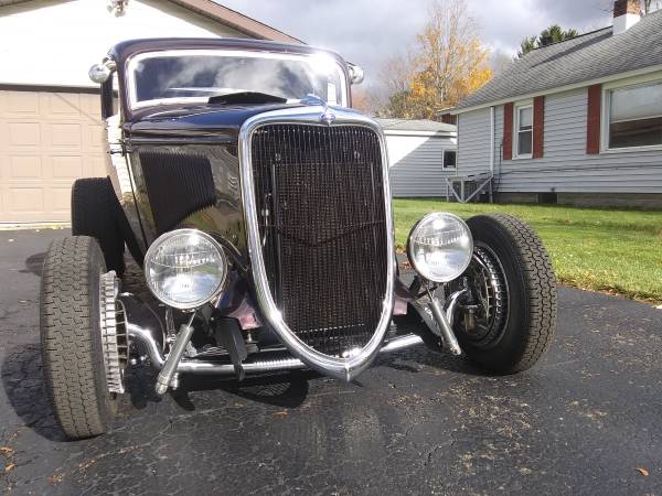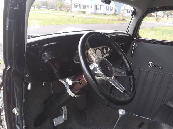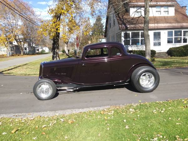 1934 Henry steel 5W coupe. Completely redone, built 347 Ford stroker, full roller, aluminum heads, Holley carb. AOD trans, Ford 9" Posi rear with disc brakes, 3" chop, beautiful perfectly straight body and show quality paint, there are a lot of reflections in pics from the leaves and edge of lawn, there are no flaws in paint. working cowl vent, SoCal hidden disc front brakes, new interior, Bluetooth stereo, new ET wheels, A/C hidden in trunk. Only 1350 miles on build. Cash or wire transfer. Don't bother me with the cashiers check scam.