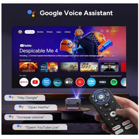 [Intelligent Voice Control & Smarter Living] Just press the mic button on your smart projector remote and speak your command naturally. Try commands like "Play The Crown on Netflix," "Lower volume, " or "What’s the weather?" Go beyond the basics: search across apps, open YouTube or Prime Video—say goodbye to tedious remote typing! This outdoor projector supports Cast, allowing you to stream directly from your iOS, Android device. Perfect for home theater, outdoor portable movies, and camping trips!