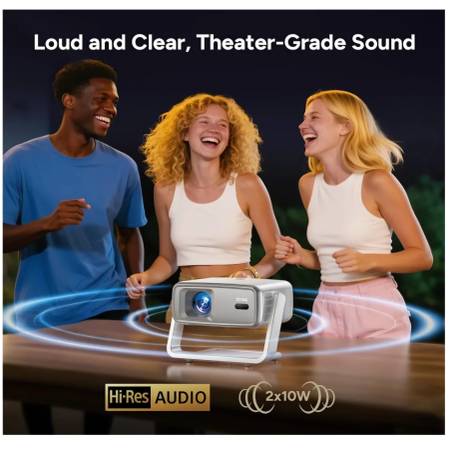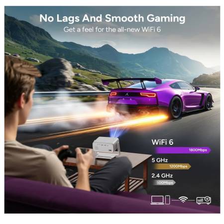 [Powerful Audio & Seamless WiFi 6 Connection] The WiFi Bluetooth Projector features 2x10W Hi-Fi speakers for a superior viewing experience, delivering rich, cinematic surround sound without distortion, every movie night will become a smooth auditory feast. And Easily connect wireless speakers or headphones. Lagging while playing games? WiFi 6 technology delivers speeds up to 9.6 Gbps, nearly three times faster than WiFi 5, for smoother streaming, gaming, and screen mirroring. And connect PS5/Switch via HDMI port for lag-free gaming.