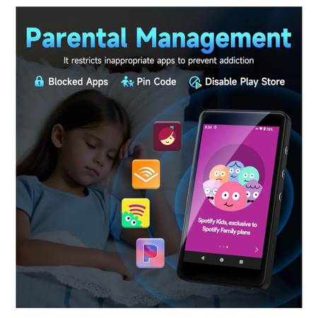 ćParental Controls for KidsćThis music player comes pre-installed with the "Parental Management" function, designed specifically for kids and teenagers. With a simple switch operation, you can directly enable or disable apps(Even the Google Play Store can be disabled). A parent passcode can also be set. Parents no longer need to worry about their children accessing unnecessary apps, making it a dedicated MP3 player for kids.
