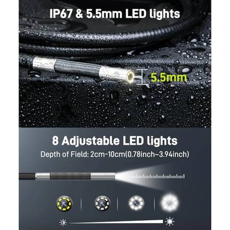 ćFlexible Semi-Rigid CablećThe 3.9FT flexible semi-rigid cable is perfect for accessing narrow nooks and crannies, paired with 8 adjustable LED brightness levels, it ensures clear visibility, controlled by long-pressing the photo button, cycling through bright, medium, dim, and off modes.