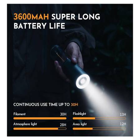 【4-IN-1 Light Mode】: One button switch, rotate the torch light to adjust the lighting modes. There are 4 different light modes, area task light 200lm cool white 5000K, camping flash light 650lm cool white 5000K, reading light warm white 60lm 2700K, and ambient filament light suitable both for indoor and outdoor use. The camping light also has an SOS mode, which can be activated by short press the button twice.