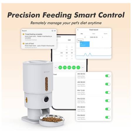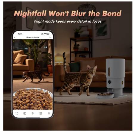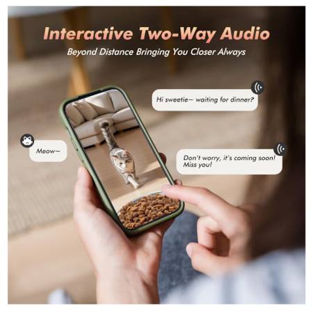 Two-Way Audio: The timed cat feeder's built-in advanced microphone and speaker allow you to stay connected with your pet anywhere, anytime. You can call your cat and interact in real-time, enjoying the experience of remote interaction. You can also record a voice message, which will play while dispensing food to remind your pet it's mealtime