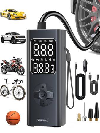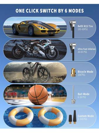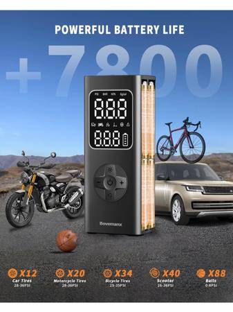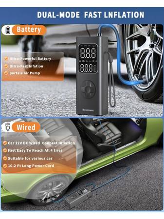 [Dual -Mode Fast Inflation ] Cordless & Wired connection for inflation. Ensure your journey can inflate quickly anytime, Anywher. Whether it's on the road or in the wild. Portable car tire inflator cigarette lighter supports 12V DC car power input .Match a 10ft DC charging cable. So you can switch to vehicle power when needed. Works even with no batterypower. Easily Respond to the Emergency Situation of a flat tire. Suitable for every journey. In a fully charged state, Fills up to 20X car tires (28-36 PSI), 113X motorcycle tires(28-33PSI), 19X bicycle tires(0-150PSI), and up to 120 basketballs(0-8PSI).
