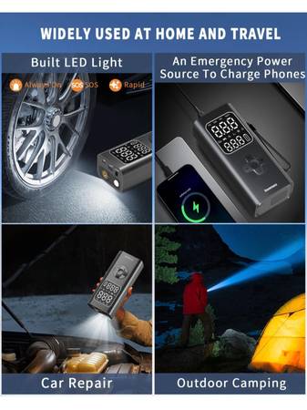 [Lighting & Power Bank Emergency Use] This portable air pump comes with an LED light and a high-capacity battery. It can be used as a flashlight for tire inflation, car inspections, and repairs during nighttime long drives or camping. It can also charge digital devices such as smartphones, watches, and Bluetooth headphones during your journey to handle emergencies. This portable tire inflator compressor is also an essential item for daily use.