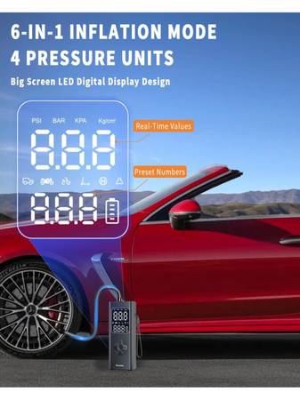 [Multifunctional and Smart] This car tire pump features a high-definition large screen LED digital display, clearly showing actual inflation values and preset values. It features 6 preset modes for cars, motorcycles, bikes, scooter, balls and custom, along with a customizable mode up to 150PSI. Four pressure units (PSI, kPa, BAR, and KG/CM²) can be easily switched.