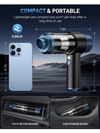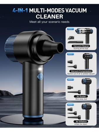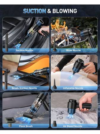 💠【4-IN-1 Car Vacuum Cleaner】Handheld Vacuum cleaner used with 7 accessories can be used to get 4 modes of suction, blowing, inflation and vacuum compression to meet your different use scenarios. Floor brush and nozzle brush can easily suck up all kinds of debris. Blowing nozzle can be used to blow away dust from keyboards and narrow crevices. Two sizes of universal nozzles can quickly inflate or expel air from objects such as swimming rings, mattresses, etc