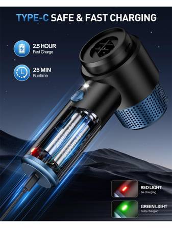 ⚡【Type-C Fast & Safe Charging】Portable car vacuum cleaner has a built-in 4000mAh battery that can be recharged and used repeatedly, which is more environmentally and energy efficient. Quickly charge mini car vacuum cleaner using the USB port of your computer, mobile power, car charger, etc. You can also use the 5V/2A adapter to fully charge it in 2.5 hours (red light for charging, green light for fully charged) with 25min of run time