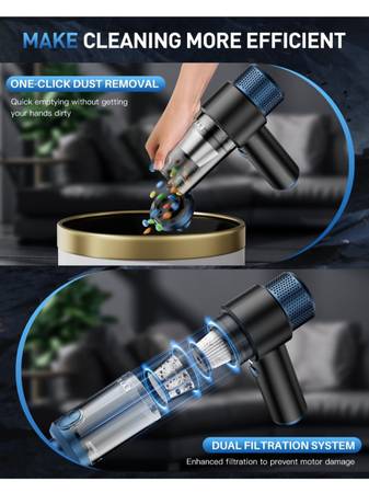 🗑️【Dual Filtration System】Car vacuum portable cordless cleaner comes with an upgraded dual filtration system that prevents suction loss and clogging. It has two reusable filters, the steel filter can effectively filter large particles of debris, and the washable HEPA filter can effectively filter tiny particles and dust to prevent damage to the motor. The one- click dusting design makes cleaning easier. With just one click, the dust cup can be easily emptied