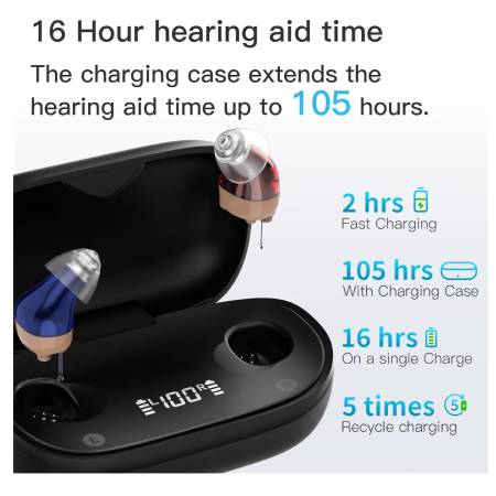 Long-Lasting Capacity & Rapid Charging: Stay connected all day with a rechargeable hearing aid that delivers 16 hours of continuous use after just 2 hours of charging. The portable charging case provides 5 extra charges (105hours total), eliminating battery anxiety. Perfect for seniors and active users, this invisible hearing aid ensures uninterrupted hearing support wherever you go.
