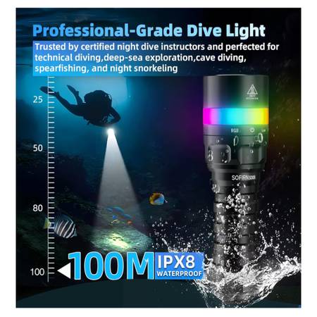 Sofirn SD08 Diving Light, 3200lm Bright Scuba Diving Flashlight, IPX8 Waterproof Rating, with RGB Signal Ring, Submersible up to 100 Meters, Easy Twist On/Off, Pro Grade Underwater Gear, Long Runtime