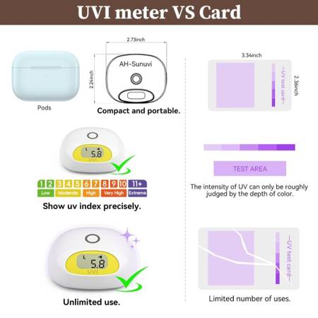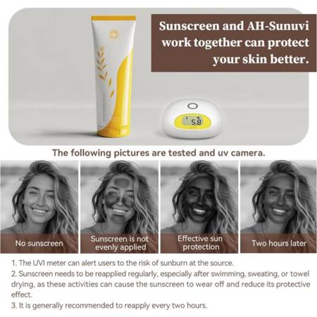 The UVI meter can alert users to the risk of sunburn at the source. While sunscreen requires uniform application of 2 milligrams per square centimeter of skin to achieve optimal results. Additionally, sunscreen needs to be reapplied regularly, especially after swimming, sweating, or towel drying, as these activities can cause the sunscreen to wear off and reduce its protective effect. It is generally recommended to reapply every two hours.