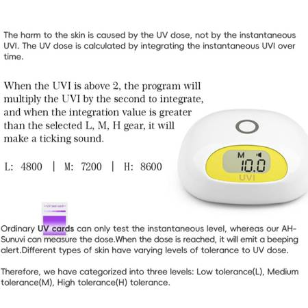 Instantaneous UV light does not immediately harm skin, and only a certain dose can damage skin, depending on the time of exposure. Therefore, we have set up this function to alarm when the UV hurt dose is reached.