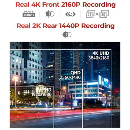 【4K UHD FRONT & 2K QHD REAR】Equipped with a high-performance Sony STARVIS IMX415 sensor, the front camera captures stunning 4K UHD video at 30fps, ensuring every detail is recorded with exceptional clarity. The rear Galaxycore GC4653 sensor delivers crisp 2K QHD footage, providing comprehensive coverage and enhanced visibility, day or night.