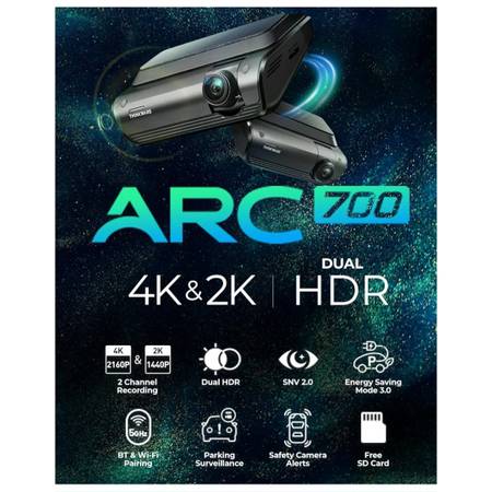 THINKWARE ARC 700 4K Front and 2K Rear Dash Cam - Wi-Fi, GPS, HDR, Parking Mode, Radar Compatible, Speed/Red Light Alerts, Included 64GB MicroSD, Hardwiring Cable