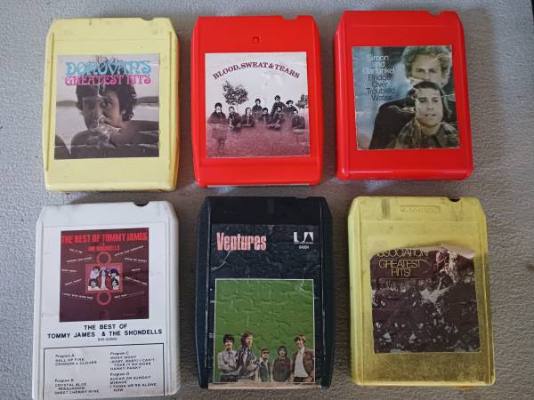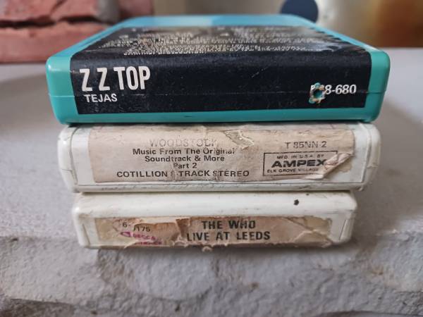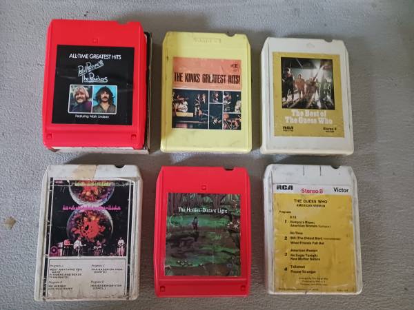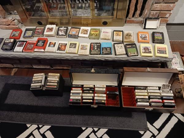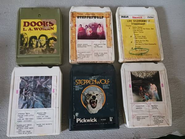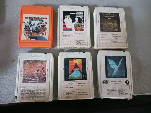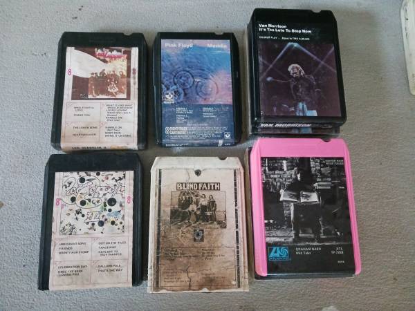 EXTENSIVE COLLECTION OF ROCK AND ROLL 8 TRACK TAPES. STONES, BEATLES, WHO, HENDRIX, WOODSTOCK, DOORS, STEPERWOLF, JOE COCKER, GRAND FUNK, SLY, ANIMALS, NEIL YOUNG, CROSBY STILLS, RASCALS, MOUNTAIN, GUESS WHO, PAUL REVERE, KINKS, BEACH BOYS, CREADENCE CLEARWATER, ALICE COOPER, KINKS, LED ZEPLIN, VAN MORRISON, PINK FLOYD, EAGLES, BOWIE, DONOVAN, ZZ TOP, ELTON, AND A BUNCH MORE!