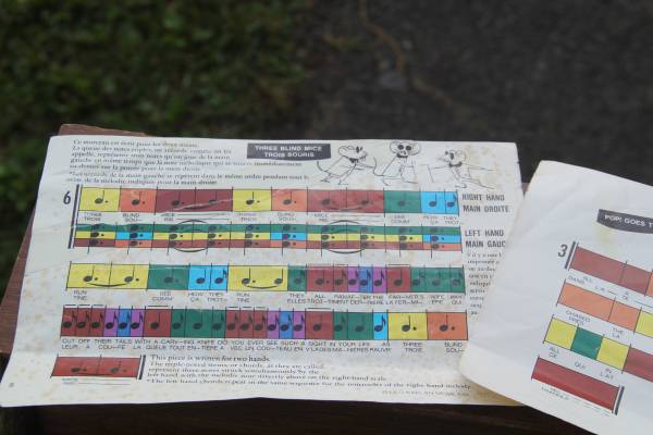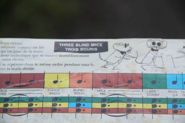The coolest! EVER! Tiny Tabletop piano--RARE to find the key chart and sheet music to OLD SKOOL nursery rhymes--in English AND French!!! Classic Plinkity Piano sound for the excited little music enthusiast in your orbit! Travel back to yesteryear! Retro coolness! Great shape! All keys work! Some minor wear but its the cutest! Must see! (and play lol)