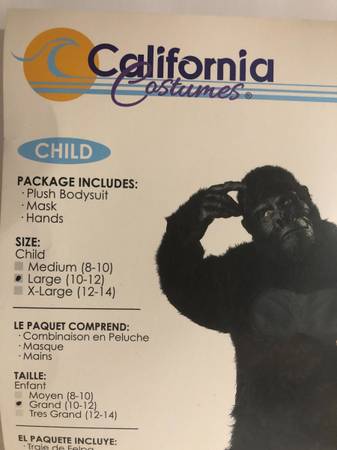 CHILDS SIZE LARGE (10-12) GORILLA COSTUME, INCLUDES SUIT, MASK AND GLOVES, USED LIKE NEW CONDITION.