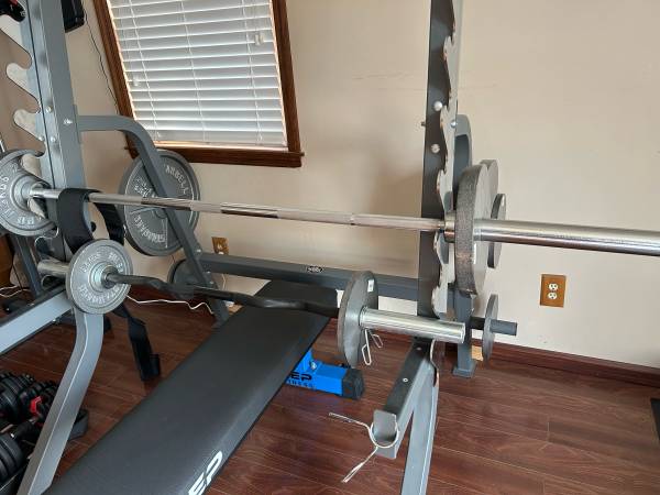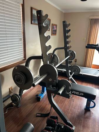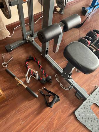 Equipment costs were Commercial Squat Rack cost $699, 7 ft Olympic barbell cost $160, Standard Olympic plates 300lbs -2 45lb, 2 35lb, 2 25lb, 8 10lb, 2 5lb, cost $440, Leg curl/ extension and curl machine cost $699, Tricep rope cost $40, Lat machine Cost $899, Rogue EZ curl bar cost $235, REP Fitness Professional Bench cost $160, tall extra bars, clamps and bar extensions. All like brand new. All cost over $3200. Bought most at Pacillos. All sold together, will not separate.