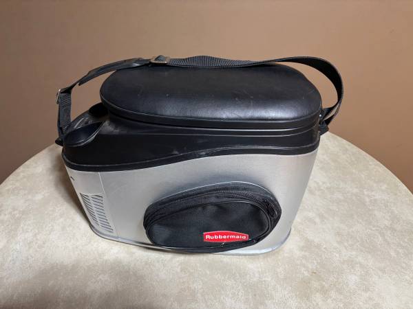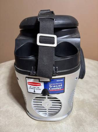 Rubbermaid Portable Travel Cooler and Warmer with 12 Volt DC Plug for power adapter for in vehicle use. Plug directly into vehicle cigarette lighter or power boat outlet. Cooling functions chill contents to 40 degrees or heats contents to approximately 120 degrees with a flip of a switch. Great for tailgating, summer road trips, beach, or on your power boat. $30 - Call Roger 16 Nine Three Seven 6124