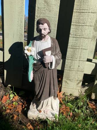 Very heavy solid concrete statues . Mary is 26 “ tall . Joseph 24.5. Both are in good condition structurally , however Mary could use paint job , or use as is as I have for years . Buyer please be aware that these statues are very heavy and muddy . You will need to remove from yard . $45 for both.