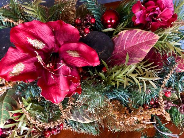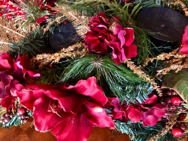 Very Like New Beautiful Xmas centerpiece Wrought iron base with 3 candle holders Abundant colorful floral, greenery and bulbs Gold sparkle details 32”