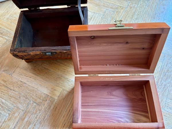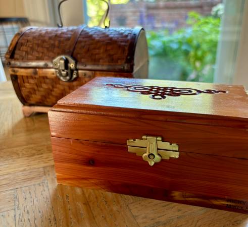 Cute Trinket Boxes with Lids Woven wicker hinged lid and wire handle Wood cedar lined with hinged hand carved lid Snap latches Excellent Condition $5. Two piece Set!