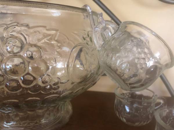 Vintage 1960’s Jeanette Crystal Glass Punch Bowl Set With 12 punch glasses and hooks This is a beautiful set, great for entertaining fur the holidays, parties… Embossed fruit pattern, very retro...